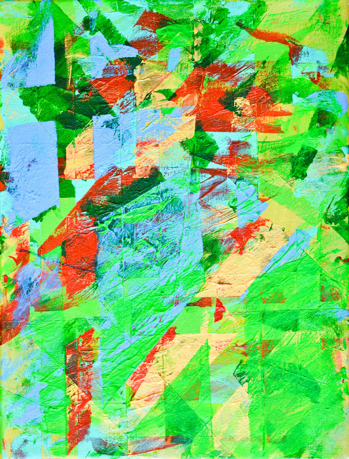 I feel good when I paint. Big brushes on a big canvas work best. Sometimes I also like to put tape or tissue paper on the canvas before I paint.